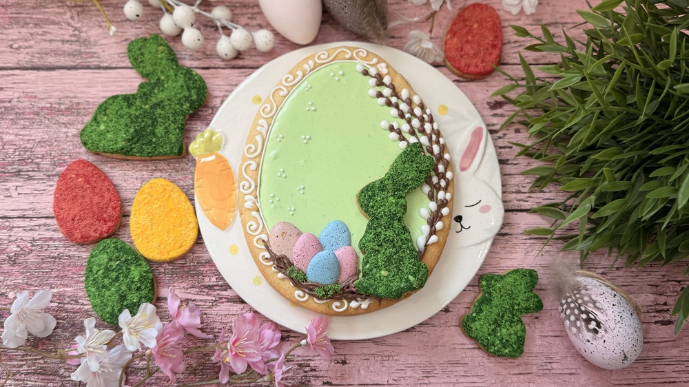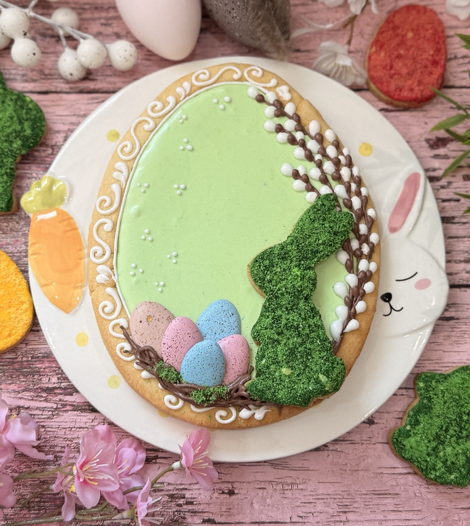 Podczas warsztatów pokażę Ci wszystko krok po kroku – od przygotowania idealnego ciasta kruchego, przez wykonanie pysznego pistacjowego kremu na bazie białej czekolady, aż po dekorowanie mazurka lukrem i efektownym, kolorowym mchem jadalnym. Wspólnie przygotujemy jeden kompletny mazurek w kształcie jajka o wielkości ok. 20 cm oraz 4 małe lukrowane dekoracje: króliczka i 3 jajeczka.