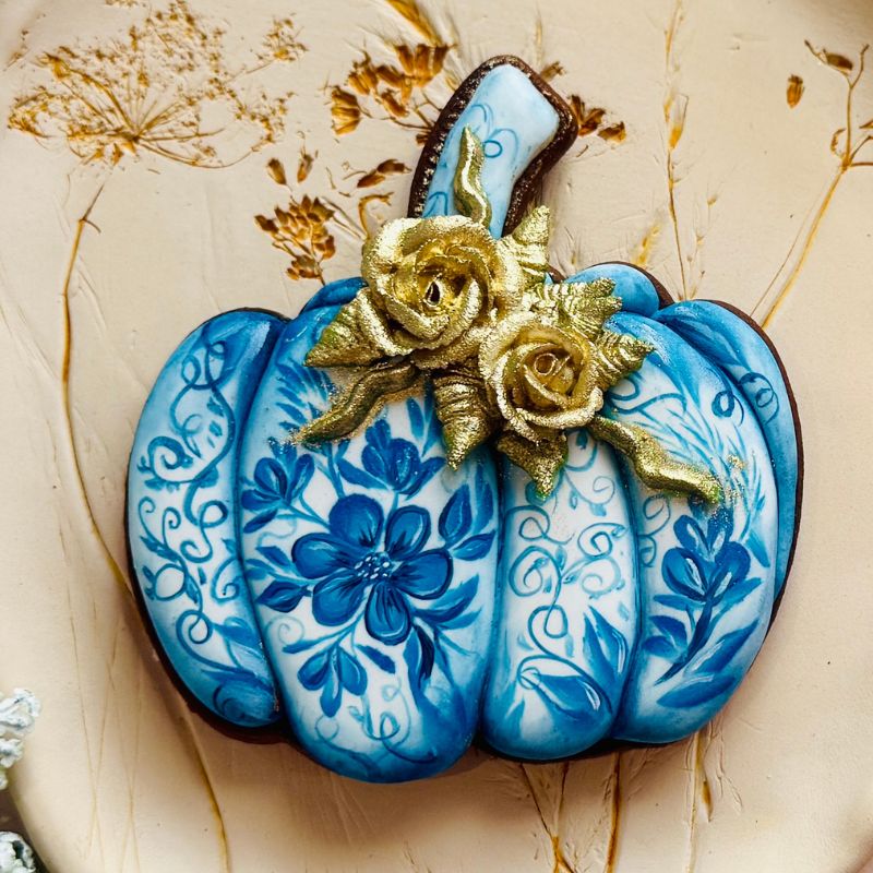 Całość ozdobimy dodatkowo kwiatami z masy cukrowej odbitymi w silikonowych formach i wykończymy złotym barwnikiem, aby nadać dyni elegancki i luksusowy charakter. To połączenie subtelności, precyzji i odrobiny blasku sprawi, że Twój pierniczek zachwyci każdego i stanie się prawdziwą jesienną perełką na stole.